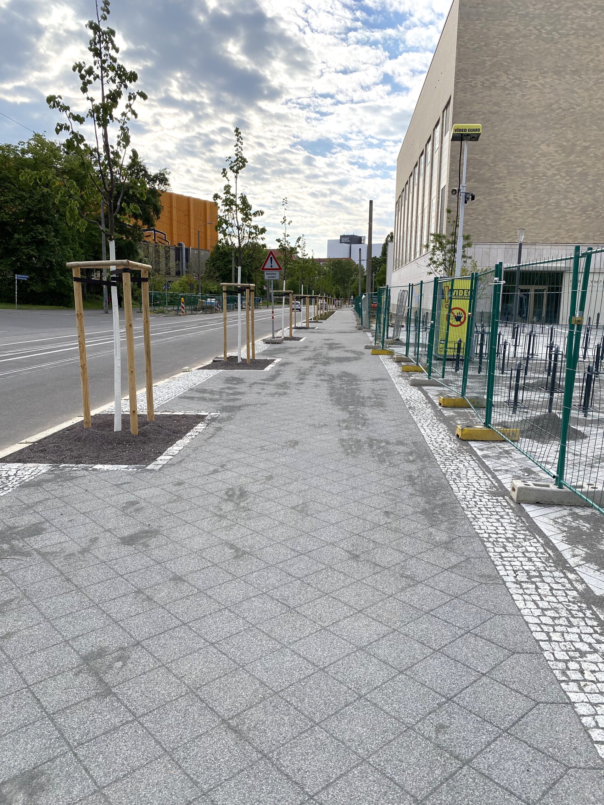 Der Gehweg zwischen Prager Straße und Karl-Siegismund-Straße wurde auf über 200 Metern vollständig erneuert. Neben einem stabilen, langlebigen Oberbau mit Carenaplatten und Frostschutzschichten lag ein besonderer Fokus auf der Begrünung: Zehn neue Stadtlinden (Tilia cordata ‚Greenspire‘) wurden gepflanzt – mit viel Raum zum Wachsen.